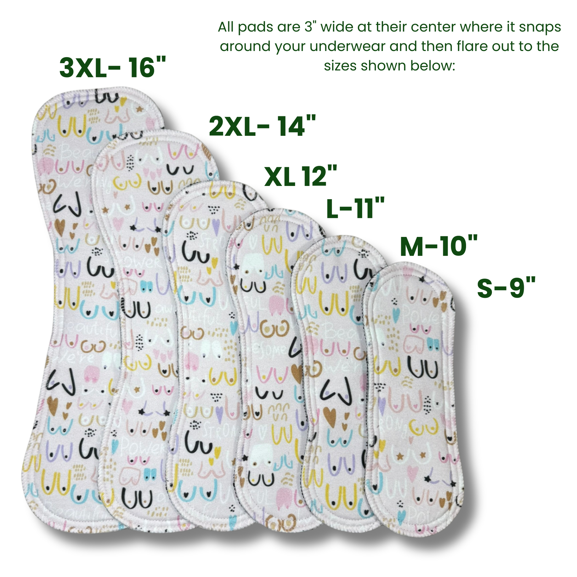 - All Millie Pads™ measure 3” wide and snap securely around your underwear.